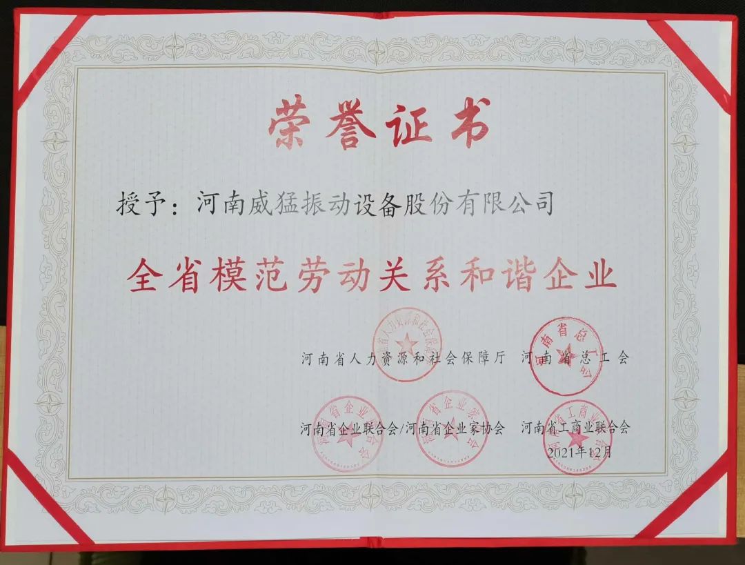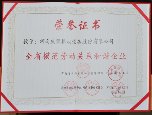 2022年7月,河南威猛振動設備股份有限公司被河南省人力資源和社會保障廳、河南省總工會、河南省企業聯合會/河南省企業家協會及河南省工商業聯合會授予“全省模范勞動關系和諧企業”榮譽稱...