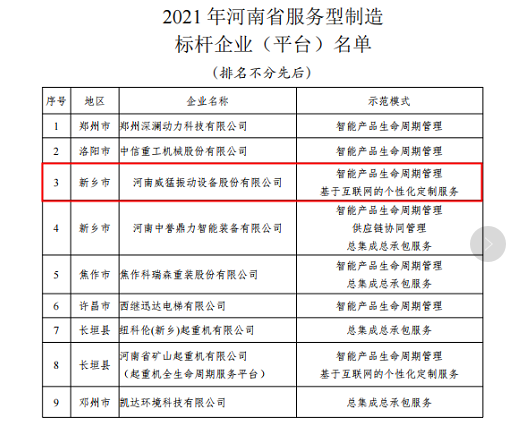 2021年12月31日,河南省工業和信息化廳公布了2021年河南省智能制造服務型制造標桿企業名單,共評選出10家智能制造標桿、9家服務型制造標桿,威猛振動...